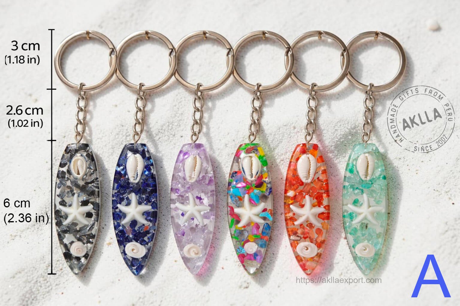 The Surfboard style is the signature design — a sleek, elongated surfboard shape measuring 6 cm / 2.36 in long and 2.6 cm / 1.02 in wide, with a 3 cm / 1.18 in keyring. Inside the clear resin you will find sparkling crushed crystals, a real cowrie shell at the top, a white resin starfish at the center, and a small spiral shell at the base. Available in 6 colors: Black, Blue, Lilac, Multicolor, Orange, and Turquoise — each one as eye-catching as the next.