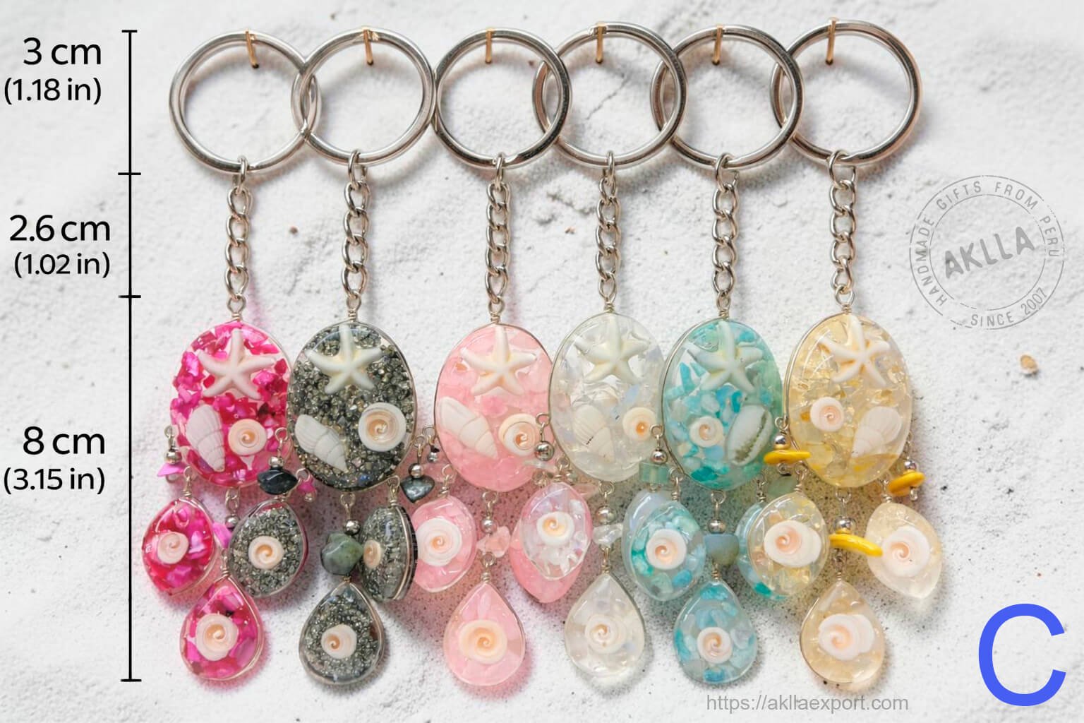 The Oval style offers a beautifully balanced design — an oval resin piece measuring 8 cm / 3.15 in with a 3 cm / 1.18 in keyring and 2.6 cm / 1.02 in chain, also hanging with smaller resin accent drops below. Like the other styles, it features real shells and resin starfish embedded in the resin with sparkling crystal fill. Available in 6 colors: Fuchsia, Gray, Pink, Clear, Turquoise, and Yellow — a perfect palette for ocean-inspired tones.