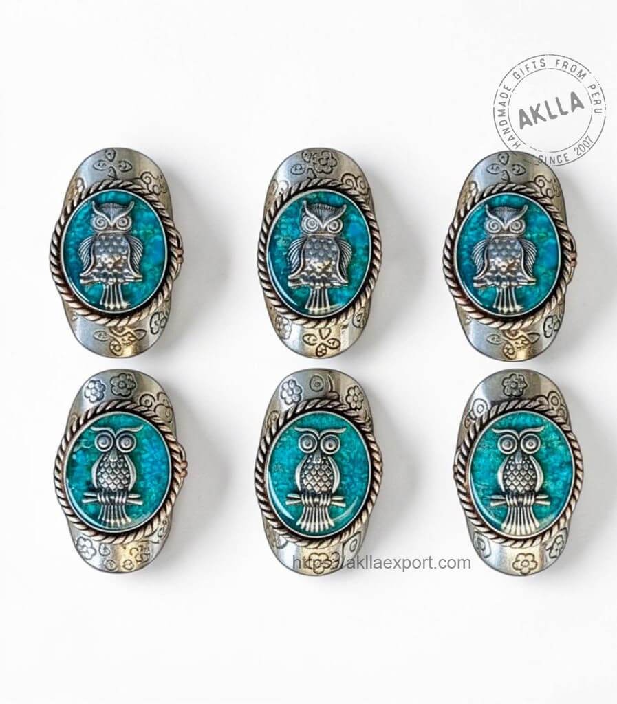 Add a touch of nature and mystique to your everyday look with this stunning turquoise ring, handcrafted from alpaca silver and finished with a captivating owl design encased in clear resin. Every detail of this ring tells a story — from the rich, deep tones of the reconstituted turquoise mineral base to the intricate owl figure sitting proudly at the center, all sealed beneath a smooth, glass-clear resin dome that protects the design and gives it a beautiful, polished finish.